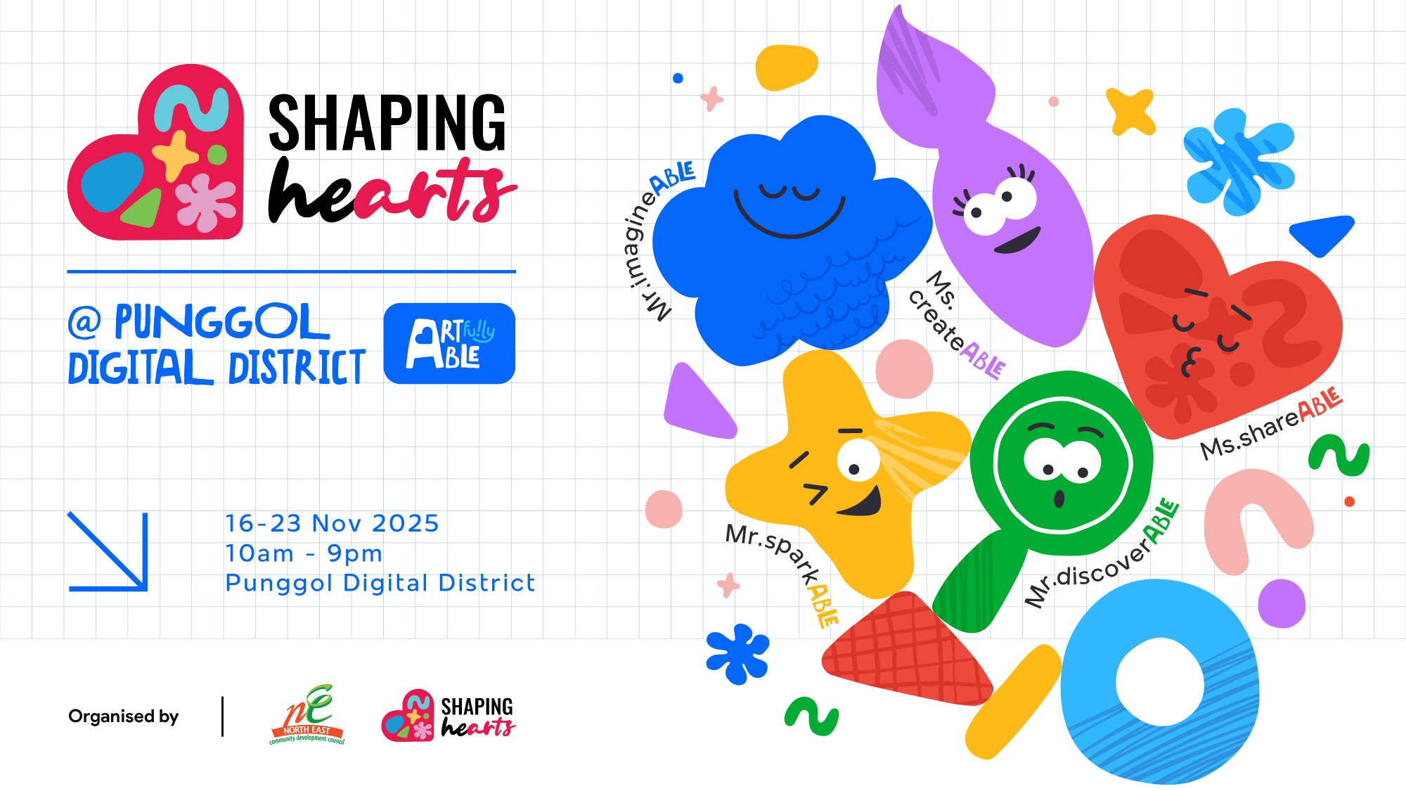 Get ready to embark on an engaging and meaningful journey at Shaping Hearts @ Punggol Digital District – ARTfully Able, with 5 exciting zones, each brought to life by a unique character. This is more than an exhibition — it’s a celebration of abilities, imagination, and joyful expression!
